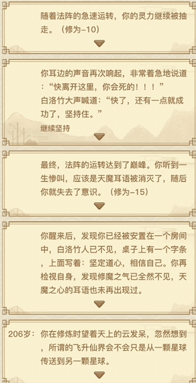 如果玩家选择了迫不得已,则会损失三十修为,之后只能进入逍遥坊尝试运气。另一种选择是我心所愿,这将导致玩家被白洛竹亲手杀死。在游戏的修仙过程中,玩家需要注意修为的积累和天赋的选择。拥有天魔之力的玩家在讨伐修魔者时可以选择旁观,从而避免死亡。