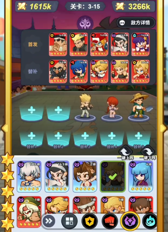 在阵容构建层面,柱子哥具备极强泛用性,可灵活嵌入多种体系。当前格斗场与爬塔玩法中验证有效的主流组合为:柱子哥 + 不知火舞 + 大蛇 + 高尼茨。其中不知火舞与大蛇提供高额爆发输出,高尼茨则承担辅助职能,通过施加减益状态与团队回血效果,强化整体续航能力。此外,其击退机制可与二阶堂红丸等具备突进+连携触发条件的角色形成战术配合,实现控制链延伸与多段伤害衔接。