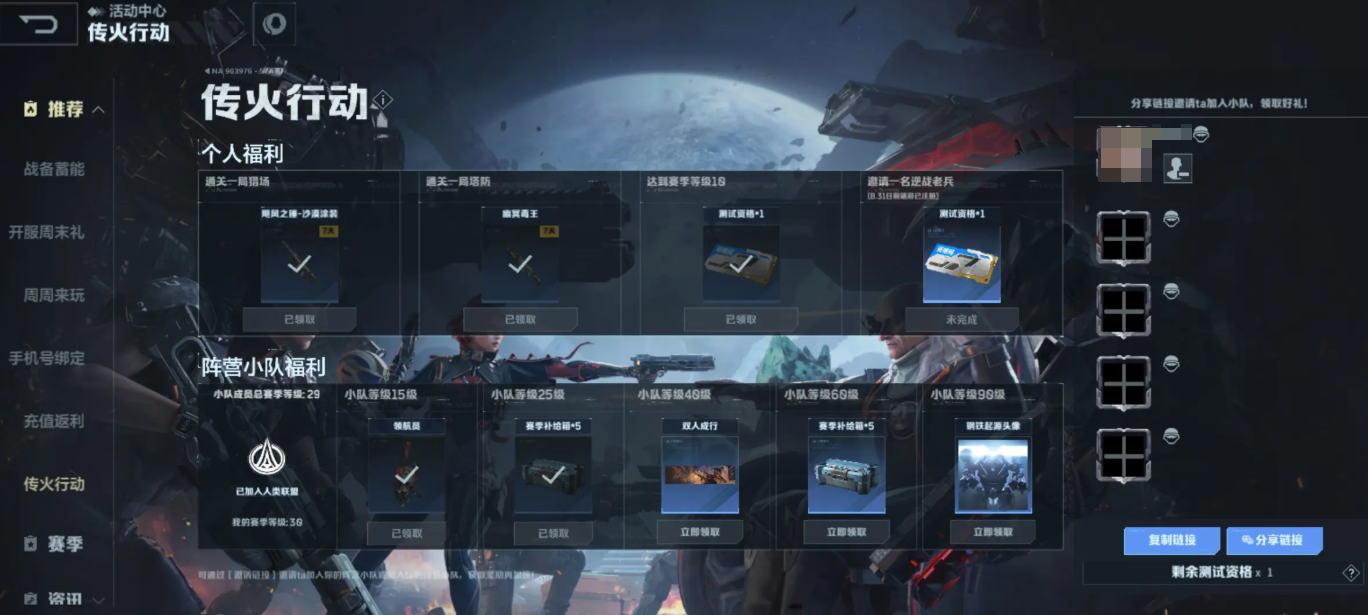 当完成“赛季等级达到10级”或“成功邀请逆战老兵”这两项条件后,玩家将获得一次测试资格的发放权利。此时可在活动界面右侧生成专属分享链接,用于邀请尚未获得资格的好友加入本次测试。建议邀请活跃度高、有稳定上线时间的玩家,以便共同推进阵营小队任务进度,助力团队达成更高等级的集体奖励目标。