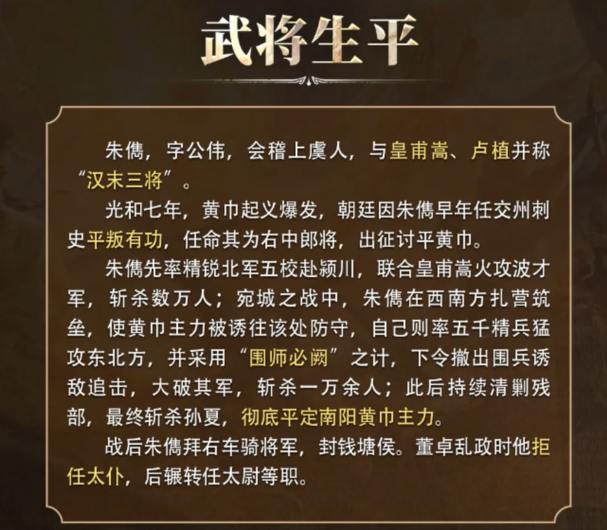 综合来看,朱儁是一位非常全能的武将,他不仅能通过谋略控制敌人、提高自己和队友的作战能力,还能通过缘分武将提供的减伤效果,在战场上为自己的阵营提供额外的保障。虽然他的武力数值可能不如一些顶级战将,但在谋略的应用上,他却有着足够的优势。如果你喜欢用智慧决胜负,那么朱儁绝对是你不可或缺的一员猛将。
