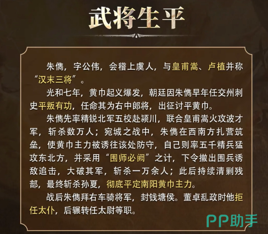 在三国谋定天下这款游戏中,众多经典的三国武将纷纷登场,而其中的朱儁,作为一位新加入的武将,显然引起了不少玩家的好奇。今天小编就带来三国谋定天下朱儁介绍。尽管他在三国演义中的名气远不如关羽、张飞等“万人敌”,但他同样是个不容小觑的角色。朱儁的登场不仅让人重新认识了这位三国中的战将,也让很多玩家对他的能力充满了期待。