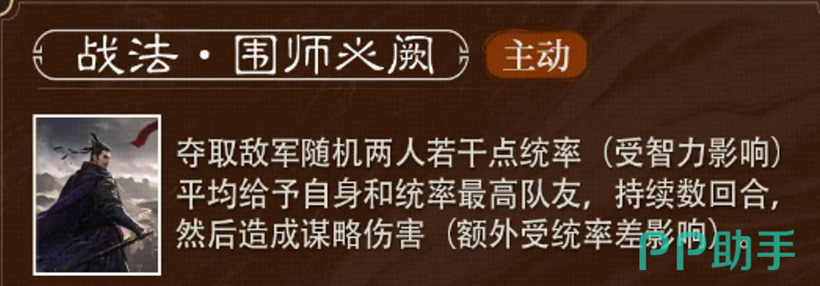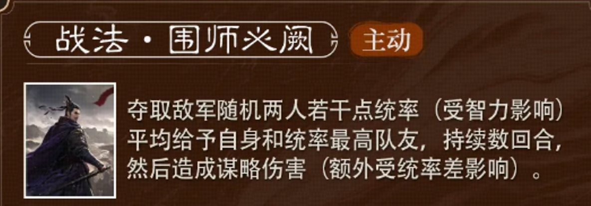 不过在三国谋定天下中,朱儁的定位并非单纯的武力型武将,而是倾向于谋略类的角色。这也意味着,在他的强项中,智慧与战略将会占据重要地位。他的战法“围师必阙”便是这方面的绝佳体现。这个技能看似简单,却蕴含着非常强大的战术优势。具体来说,朱儁能随机夺取敌方两名武将的统率点数,并且这个夺取的数值与朱儁的智力挂钩。拿到这些统率后,他和队伍中统率最高的队友将能共享这部分资源,持续若干回合,并且在战斗结束时,还能造成一定的谋略伤害。简单来说,这个技能能够大幅提升队友的作战能力,同时削弱敌方的统率,给敌军带来非常大的压力。