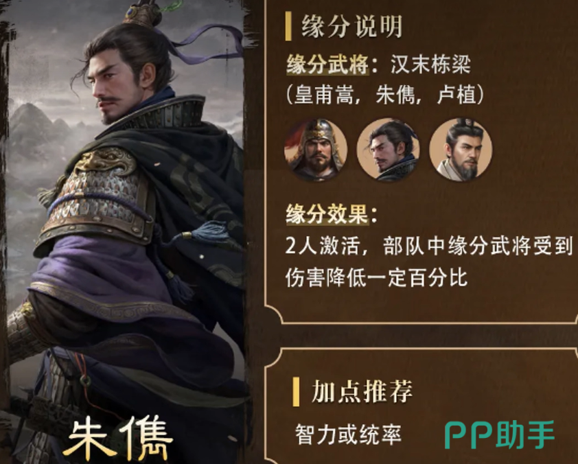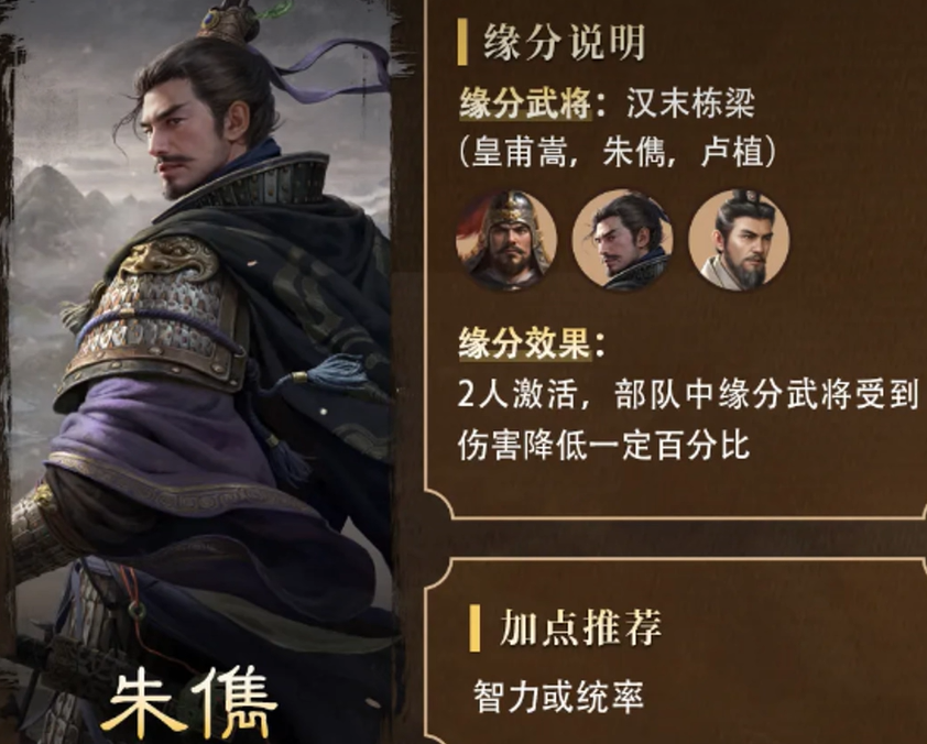 除了战法本身,朱儁的缘分武将组合也是不容忽视的一部分。与皇甫嵩和卢植共同作战时,朱儁可以激活缘分效果,使得队伍中的缘分武将受到的伤害有所降低。这种减伤效果在长期作战中无疑能提升队伍的生存能力,尤其是在面对强敌时,这种防御性加成将显得尤为重要。