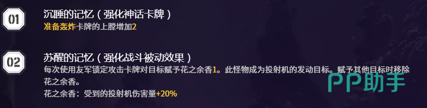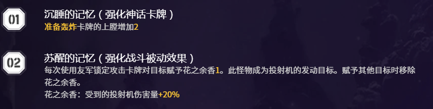 针对单体目标的爆发需求,「科沃斯基爵士」是不可替代的核心输出卡。玩家可任意指定一张已有的「投射机」,使其下一次攻击伤害提升,并额外抽1张牌,既确保高额单点压制力,又维持手牌数量平衡,避免资源断档。「自我意识」作为终结技,对全体敌人造成250%穿透伤害,兼具清场效率与后续输出铺垫功能,是应对群怪环境的战术支点。六大记忆强化路径各具侧重:例如「沉睡的记忆」提供「准备轰炸」上膛效果;「苏醒的记忆」则可在命中时为目标附加「挂花之余香」状态,形成持续干扰与伤害叠加。