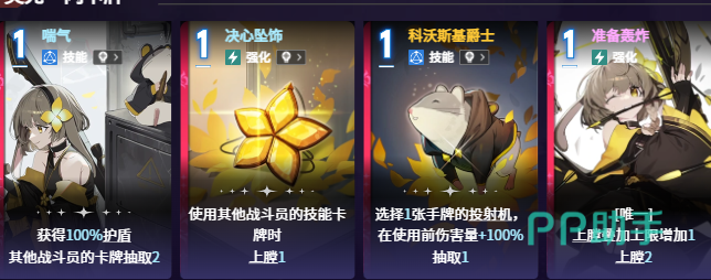 进入中期,强化类卡牌开始发挥决定性作用。「准备发射」是唯一具备开战触发机制的强化卡,开局即生成1张「投射机」,此后每回合自动补充1张,持续强化投射体系运转效率。「决心坠饰」则强化协同作战能力:每当己方队友使用技能牌时,立即完成一次上膛动作,大幅提升多角色联动下的响应速度与资源利用率,尤其适配组队副本与高难度协作挑战。
