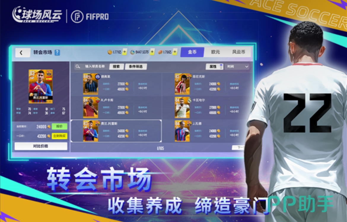 由FIFPro正版授权的足球竞技手游,游戏中有非常多国际著名职业球员的ip肖像授权,包括但不限于梅西,C罗,姆巴佩等等,覆盖了英超,意甲,法甲等欧洲联赛的大牌足球明星,绝对的入股不亏!在游戏中玩家的身份是足球经纪人,需要招募球员并组成足球队去参加不同的竞赛。游戏采用的是全球实时排位对战玩法,玩家可以和全球的足球玩家们进行pk,交流球技。快来和C罗一起决战足球之巅吧!