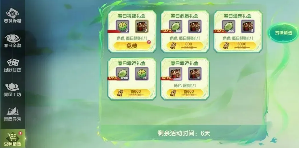 “赏味精选”聚焦礼盒体系。玩家每日可免费领取春日祝福礼盒,内含踏青骰子及全材料随机包;另设多档付费礼盒,其中春日幸运礼包第二档直赠梦幻女孩时装,为外观党提供明确获取路径。