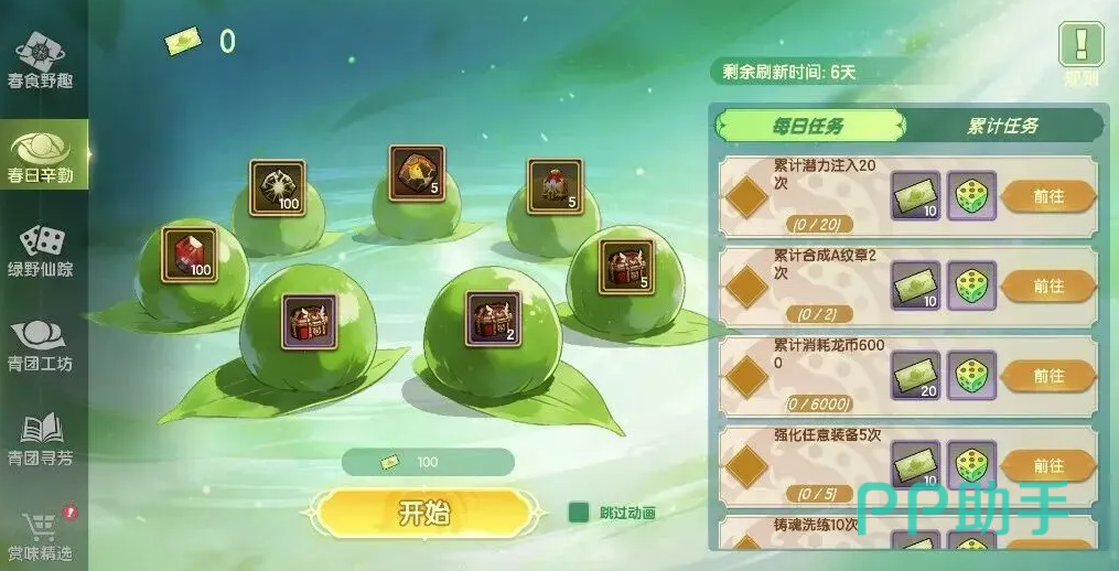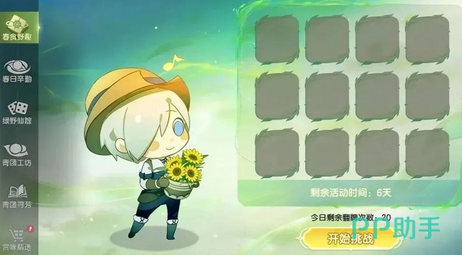 本次活动共设七大功能模块,结构清晰、操作轻量,兼顾休闲性与养成深度。首个玩法名为“春食野趣”,采用经典翻牌机制,玩家每日可参与一次,随机获得踏青骰子、强化石、潜能原石等高频实用养成材料,零门槛、高回报,是稳定获取基础资源的重要渠道。