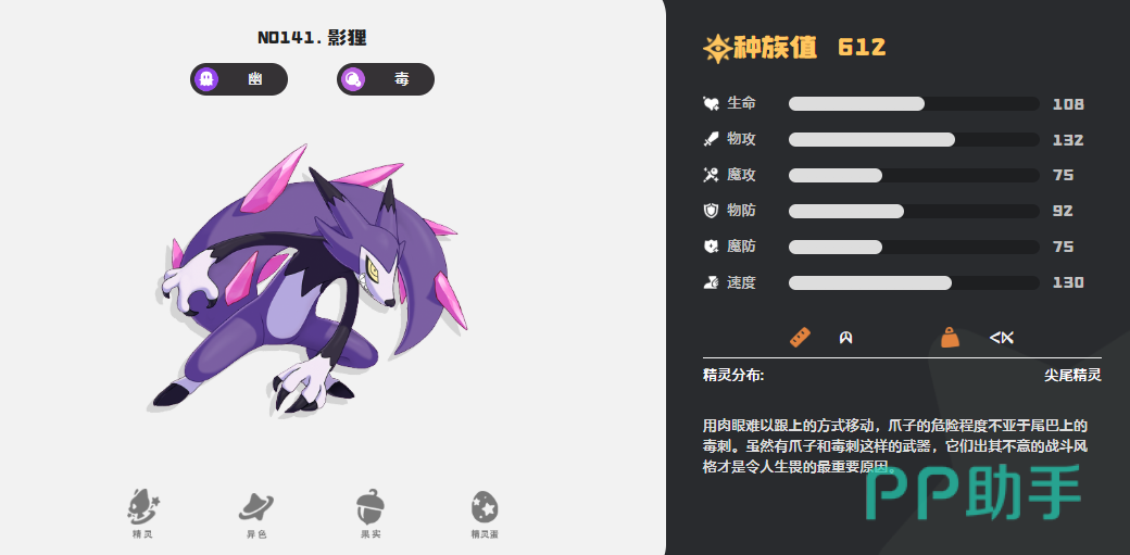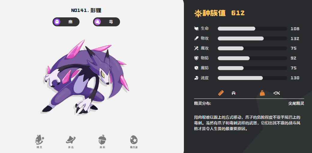 除了草系搭配外,游戏中还存在如幽灵+毒系、幽灵+恶系等复合类型。以忽幽狸为例,它是典型的幽灵+毒系双重属性精灵,进化后成为影狸,继承并强化了原有的战斗特性。凭借“黑手”特性,影狸可在敌方入场时立即施加中毒状态,形成持续性伤害输出。配合减益类技能,能在持久战中逐步瓦解对手的战术结构,非常适合打消耗战。