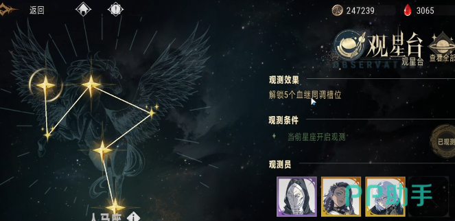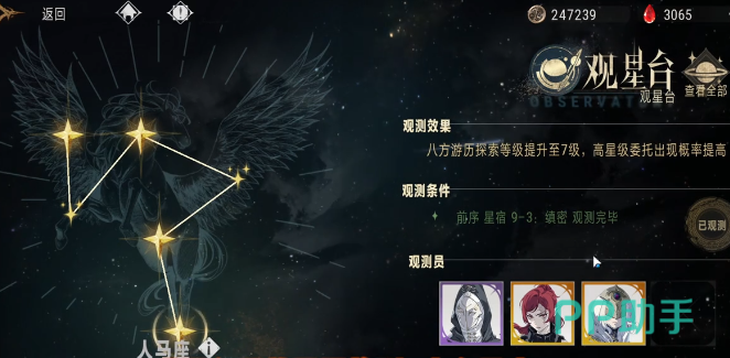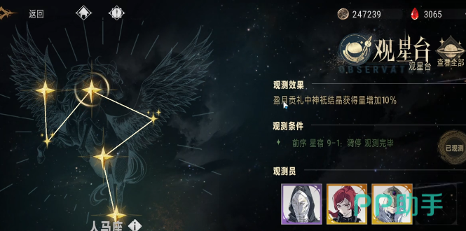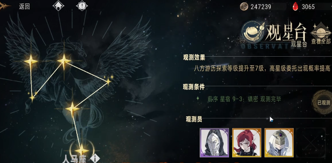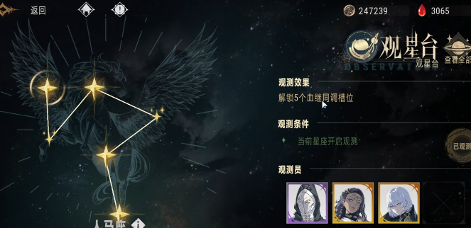 玩家可以选择优先拉满观星台的观测进度,如此就可以解锁更多轻松满足玩家在角色时的培养需求。不过目前观星台还会有一些限制,至今为止只开放到9章人马座。