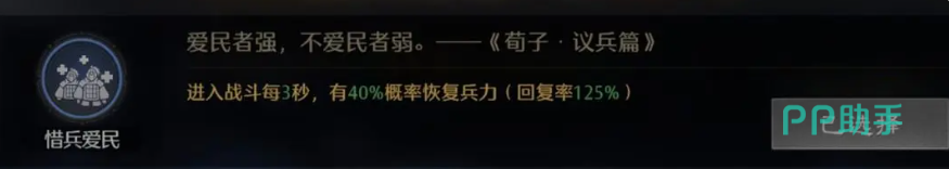徐庶应装配【惜兵爱民】与【乐山善西兵爱民】两种兵法。前者为每3秒触发一次的被动技能,拥有40%几率恢复兵力,成功触发时可实现125%的治疗量返还;后者则提升自身10%的治疗效率,双项加持下极大增强了其续航能力,保障其能在整场战斗中持续施加【重伤】效果。黄忠则推荐携带【死地求生】与【奋鼓】,两项兵法均在战斗第18秒后生效,赋予其【倒戈】能力,并在受到伤害时提升自身属性5%,进一步优化其生存与输出平衡。