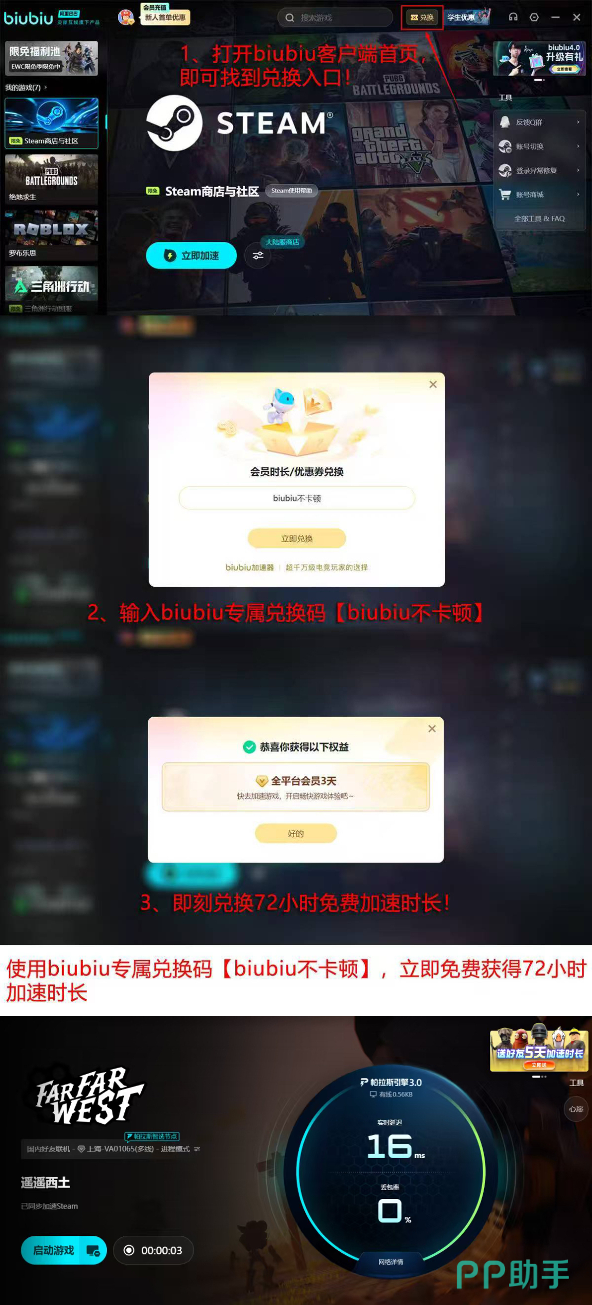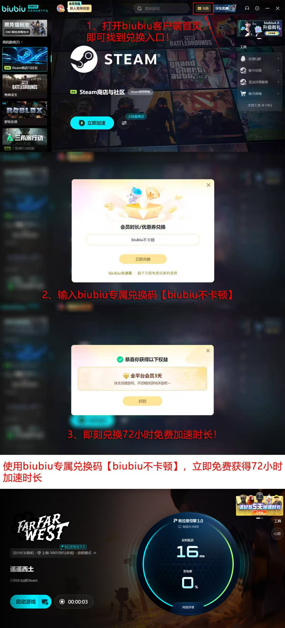 新用户注册即可获得24小时免费加速时长,叠加输入兑换码【biubiu不卡顿】还可额外领取72小时,总计96小时免费服务,足以覆盖Far Far West抢先体验初期的完整体验周期。这一组合福利兼顾实用性与时效性,为玩家提供了低门槛的高品质联机入口。