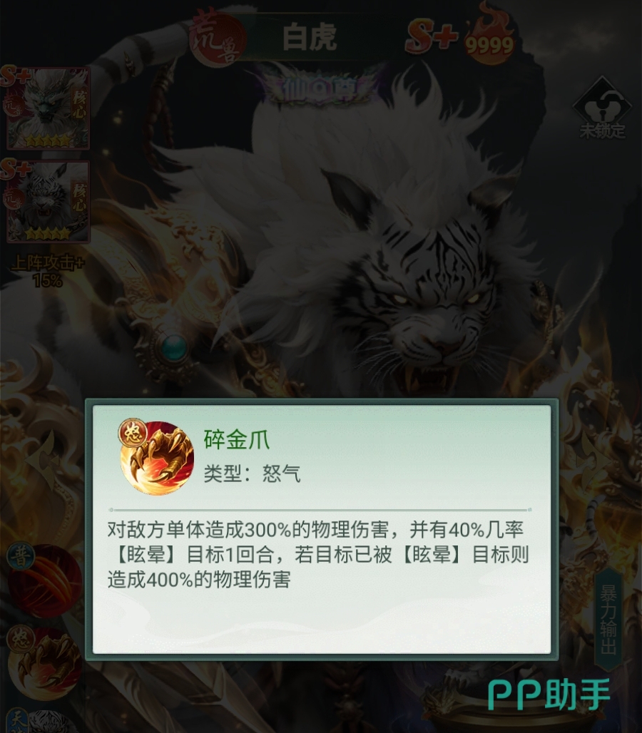 白虎的核心怒气技能“碎金爪”具备双重战术价值:一方面,该技能对敌方单体造成高额倍率伤害,并附带概率眩晕效果;另一方面,若目标已处于眩晕状态,则本次攻击将触发伤害加成机制,显著提升输出效率。这一联动逻辑既支持白虎独立完成控场+收割闭环,也适配团队协同——队友先行施加控制,即可为白虎创造更高收益的输出窗口。