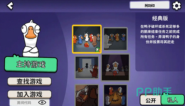 目前官方尚未公布确切的上线日期,建议玩家持续关注游戏动态,或收藏上方提供的信息入口,以便第一时间获取更新通知。游戏中玩家将化身各类鸟类角色,既要完成指定任务,也要警惕隐藏在队伍中的敌对势力——野鸭或其他具有破坏意图的角色,它们会试图干扰进程甚至暗中淘汰队友。成功完成所有任务或清除所有敌对成员即可赢得胜利。游戏提供超过30种可选角色,如秃鹫、呆呆鸟等,每种角色都有独特的获胜条件。同时配备8张以上风格各异的地图,支持自由切换与探索。