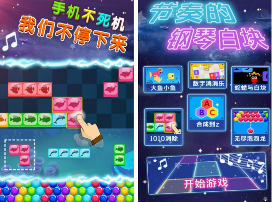 这款游戏中,除了涵盖别踩白块这样的游戏,在各种音乐当中,你需要跟随的节奏,正确点击屏幕以后,才能顺利通过关卡。还收录了很多的游戏玩法,包括泡泡龙以及宝石连线等,只要是你喜欢的游戏,都能通过点击的方式免费开启。与家里面的孩子共同玩的过程中,也可看看孩子喜欢哪种,大家通过共同合作或者是一人来一局的方式,都能感受乐趣。