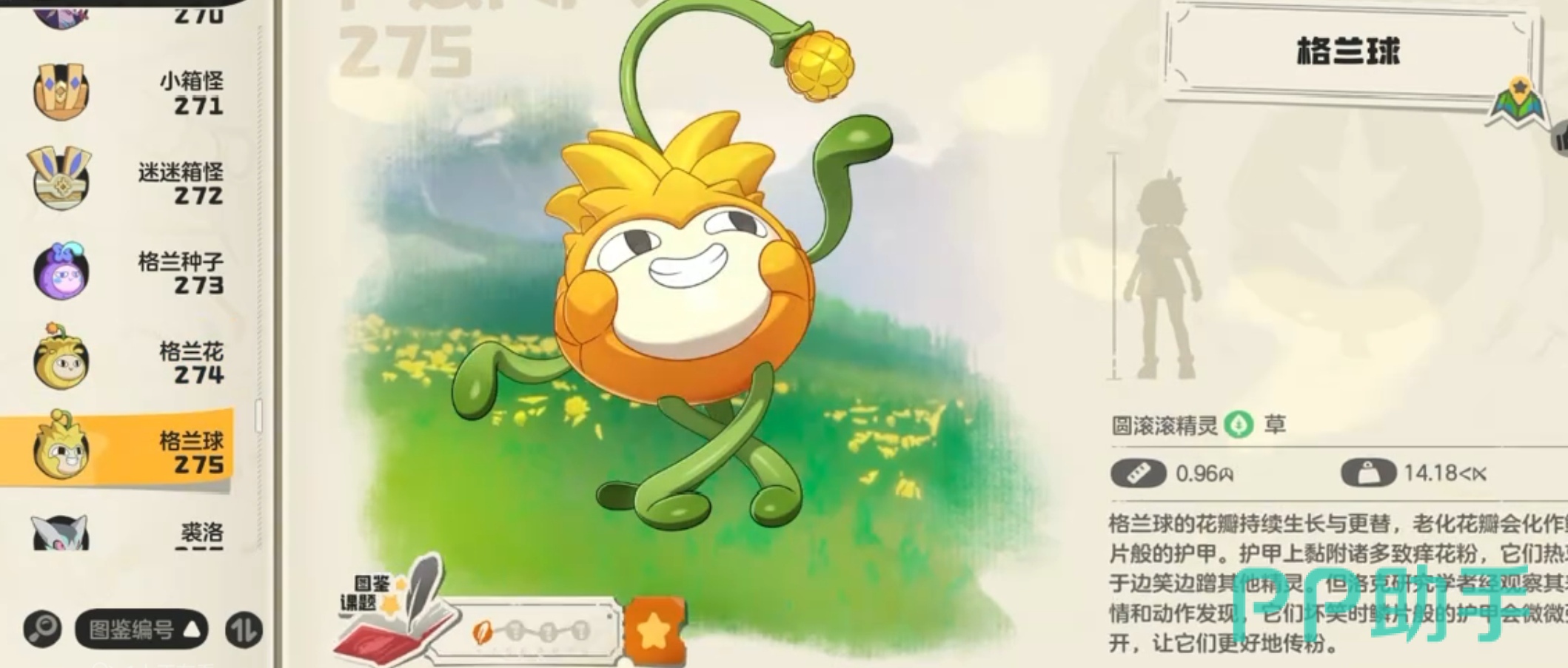 第六位推荐:格兰球 ,具备双草属性,对土系精灵具有明显优势。其特性“生长”可在每回合结束时恢复 12% 生命值,具备优秀的自我续航能力,在车轮战或持久消耗战中表现尤为亮眼,适合在命运对决模式中率先登场消耗敌方资源。可通过捕捉低等级的格兰种子逐步培养而成,而格兰种子分布广泛,易于获取,主要出现在回填山涧的魔力之源区域。