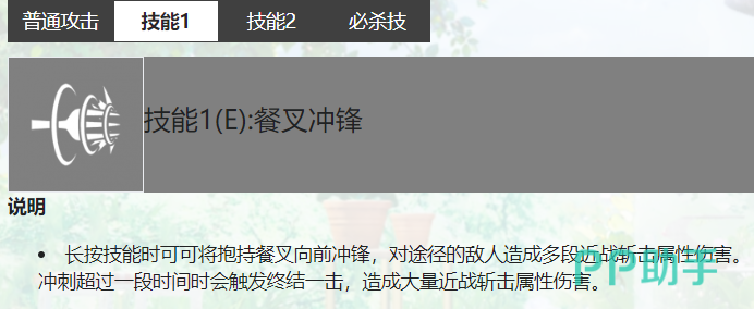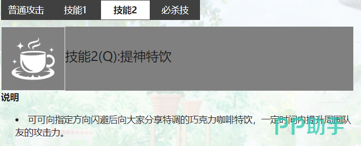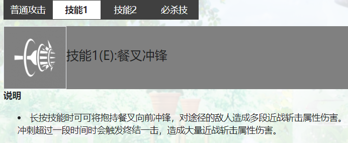 艾美·可可的1技能在使用的时候,对敌人进行多段的近战伤害,并且在她使用技能的这一段途径中也会对敌人造成伤害,由于角色的设定这个技能释放是用餐叉,非常可爱。技能2是一个群体增益技能,能够对于队友附加攻击力提升的buff。