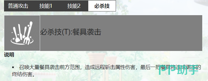 必杀技是可可的终极大招,也是一个范围性的技能。在释放的过程中会召唤大量餐具对敌人进行攻击,进行远程的斩击伤害,最后在进行必杀技的斩杀。随着这些技能的升级能够将技能威力提升,范围和数值都会得到质一般的飞跃,可可这个角色在游戏中值得玩家进行培养。