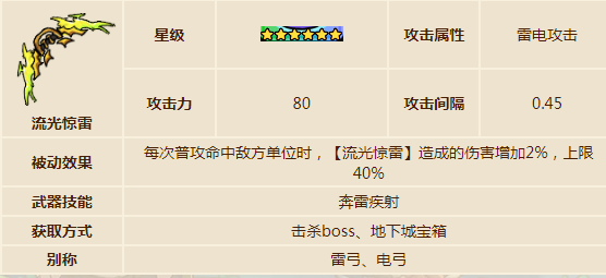 流光惊雷:被动效果在每一次普通攻击命中之后,就可以提升2%的伤害。奔雷疾射技能在释放之后,就会朝着前方连续的释放强化箭,可以直接贯穿敌人,并且还会造成雷属性伤害。玩家一旦获取之后挑战副本就会变得比较轻松。