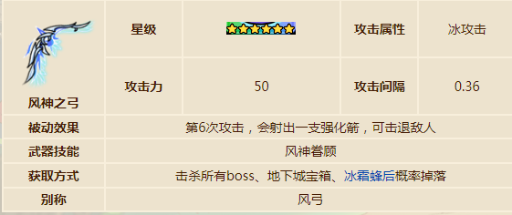 风神之弓:这把武器就可以有效提升攻击的速度,还有移动的速度,普通攻击还不会消耗体力,每一次普通攻击就会有30%的机会,可以形成小击退。每6次普通攻击就可以变成一个强化箭击,可以将敌人全部的击退。不管是清理小怪还是作用于挑战boss都拥有较好的优势。