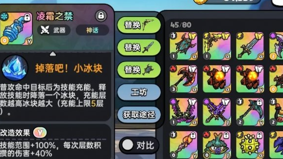 凌霜之禁:属于一个冰属性武器,在经过多次平a之后就可以获得高输出性的大招。在释放之后还可以降落冰块,从改造的效果来看,有些可以增加100%的技能范围,有些可以增加40%的伤害。玩家在经过多次平a之后就可以积攒能量,可以迅速的打出高额伤害。