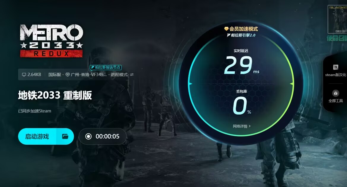 对于很多玩家关心的地铁2033重制版加速器怎么选这一问题,答案已经给大家公布出来了。虽然不开启加速器也能游戏也是能正常运行,但在运行的过程里边,大家可能会遇到严重的卡顿和掉帧问题,甚至可能导致游戏闪退。而有了这款加速器这款辅助工具的稳定网络支持,这些问题都能得到全方位的改善。