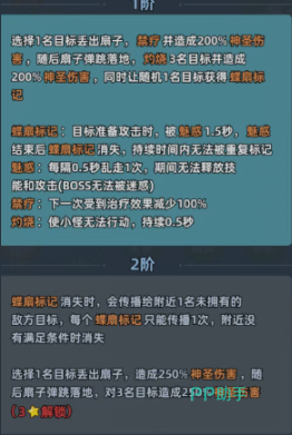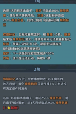 炽焰舞姬的核心输出与控制逻辑高度依赖一、二技能的协同释放。其一技能为单体起手+群体扩散型控制技:首段投掷扇刃,对首个目标造成200%神圣伤害并施加“禁止治疗”效果;扇刃落地后自动弹跳,灼烧周围3名敌人,再次造成200%神圣伤害;被标记目标若尝试攻击,将立即陷入1.5秒魅惑状态——期间无法释放任何技能,亦不可进行普攻。该技能对Boss无效,专精于小怪群控与节奏打断。