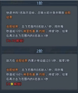 二技能则是全范围战略级压制技,无目标类型限制,Boss与小怪均可生效。一阶段突进展开火焰结界,范围内最多8名敌人被击飞;结界持续5秒,期间每秒造成120%神圣伤害,并附带持续灼烧;结界消散瞬间触发二次击飞,具备显著清场价值。二阶段解锁后,每秒伤害提升至160%,且敌方单位在结界内连续移动超0.5秒即触发2秒眩晕,极大强化了持续控场稳定性。