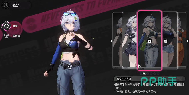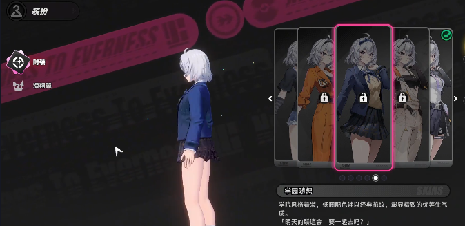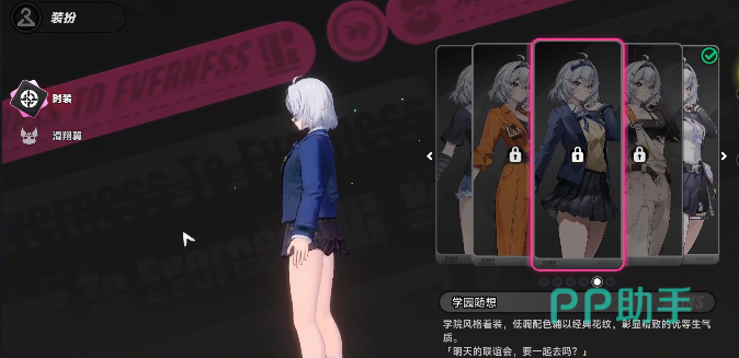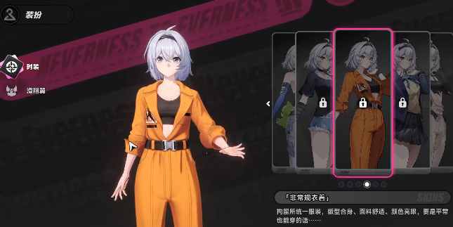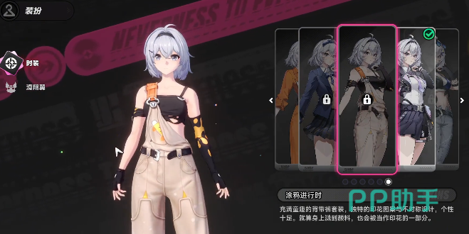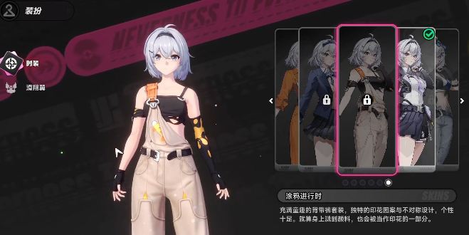 除上述外观外,主角另提供三款免费皮肤:进入监狱场景后自动解锁的定制囚服,延续统一视觉语言,强化角色身份代入;学院风校服套装,以沉稳灰蓝为主调,辅以精细暗纹与规整版型,精准呈现优等生气质;街头涂鸦风格背带裤,采用非对称结构与手绘感印花,突出年轻化与个性表达。