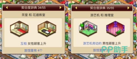 除了一些全体上升的效果之外,其实目前在游戏中也有针对某一部分客人加成的设施布局,比如说以下的几个。