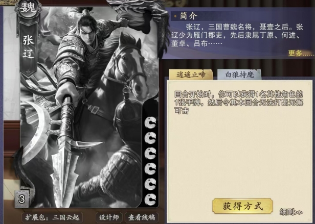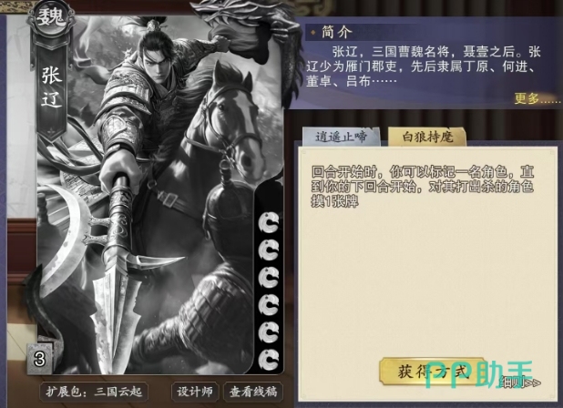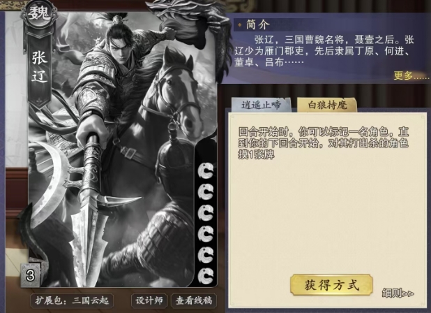 张辽的第二技能叫做白狼持麾,这项技能技能效果颇为独特,每当回合开始之际,张辽便获得了标记一名角色的能力,这个标记并非简单的装饰,而是蕴含着深厚的战略意义,一旦某角色被张辽标记,那么在接下来的回合中,任何对其打出杀的角色都将获得一张额外的手牌作为奖励,这里的关键在于,摸牌的是打出杀的角色,而非承受杀的角色。