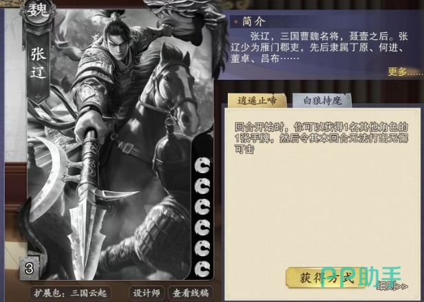 张辽在代号杀中被塑造为一张初始拥有6点体力和两个独特技能的武将卡,其形象与历史原型还是比较相近的,他的第一项技能逍遥止啼,这项技能使得张辽在每个回合开始时,都能够从其他角色手中巧妙地夺取一张手牌,同时限制对方在本回合内无法使用那张至关重要的无懈可击牌,需要特别强调的是,当张辽发动逍遥止啼技能时,被夺取手牌的角色并不会完全失去无懈可击这张牌,而是在张辽的回合内,这张牌无法被直接选中使用。