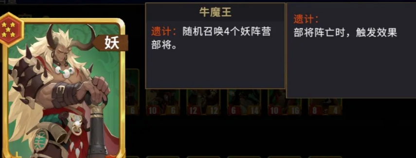 第三套聚焦「召唤不屈联动」:以石矶、牛魔王、铁扇公主构成三角核心。牛魔王每回合稳定召唤妖族部将,铁扇公主在妖族单位阵亡时赋予全妖族攻击力提升,石矶则为牛魔王提供不屈效果,确保其持续在场并维持召唤频率。三者协同形成“阵亡→增攻→再召唤→再增攻”的正向循环,使输出雪球越滚越大。