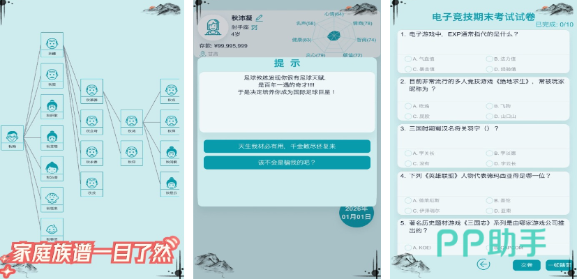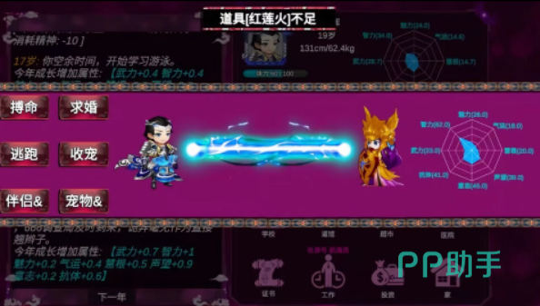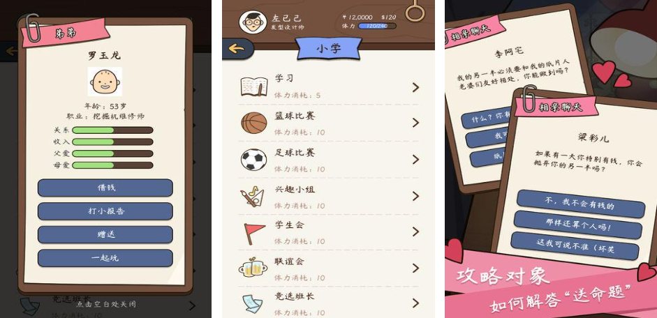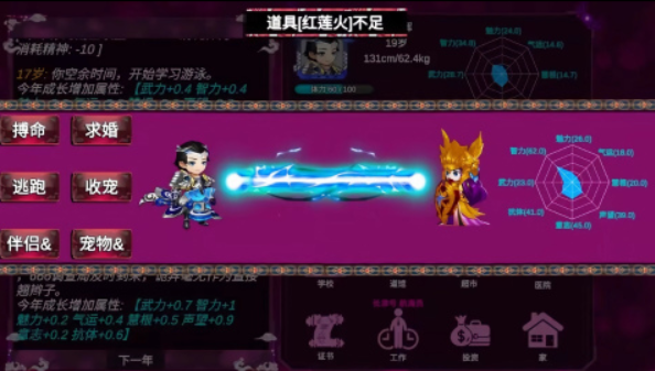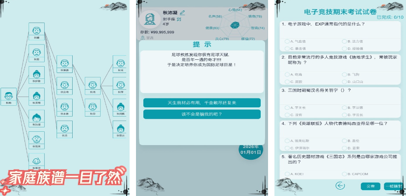 《自由人生模拟》以文字为主,涵盖了上学、考研和结婚生子等多种元素,可以让你弥补现实生活中的所有遗憾。游戏开始后系统会为你随机分配父母,如果你觉得不满意,还可以要求重新分配,直到满意为止。如果在书写人生过程中发现有部分剧情不适合你的话,还可以通过加属性点方式来影响事件的触发概率,从而改变剧情。