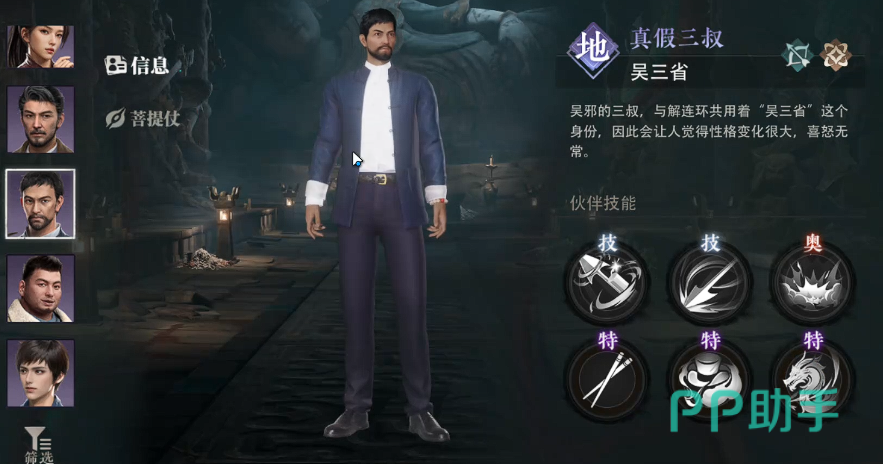 吴邪是主线叙事的核心视角人物,所有关键剧情均以他的认知逻辑推进。其专属能力聚焦于“古文辨识”与“逻辑推演”,可在密室中自动高亮关键线索,在遭遇失传篆刻、青铜铭文或帛书残卷时提供实时翻译辅助;进入高危区域后,该角色会触发“陷阱预判”机制,显著提升规避流沙陷坑、毒雾喷口及机括暗弩的成功率,是前期开荒与中后期高难度副本不可或缺的解密中枢。