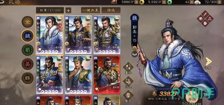 郭嘉作为最强谋士之一,其"十胜十败"技能可降低范围内敌军30%攻击力,持续3回合。在对抗吕布等高输出武将时效果显著。建议将郭嘉培养为纯策略型,优先提升智力属性。当装备"太平要术"时,其"烈火"策略可造成智力差2.5倍的伤害,是清理敌军的利器。注意保护好郭嘉,其防御力较低容易被秒杀。
