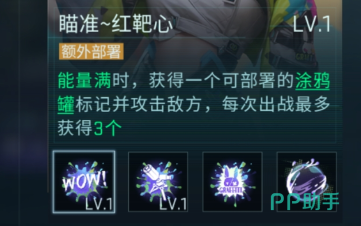 她的基础技能“瞄准~红靶心”在能量充满后可生成最多三个可部署的涂鸦罐标记。一旦部署成功,不仅能对敌方造成打击,还会激活后续技能循环。“喷绘~绿兔子”是主要输出手段,每次部署都将触发6次涂鸦射击,每段造成等同于攻击力237%的实弹伤害。若处于多人集火状态,借助“亿万大狂欢”机制,射击次数还将额外增加——每多两名参与集火的友方单位,便追加一段射击,最多可额外叠加6段。