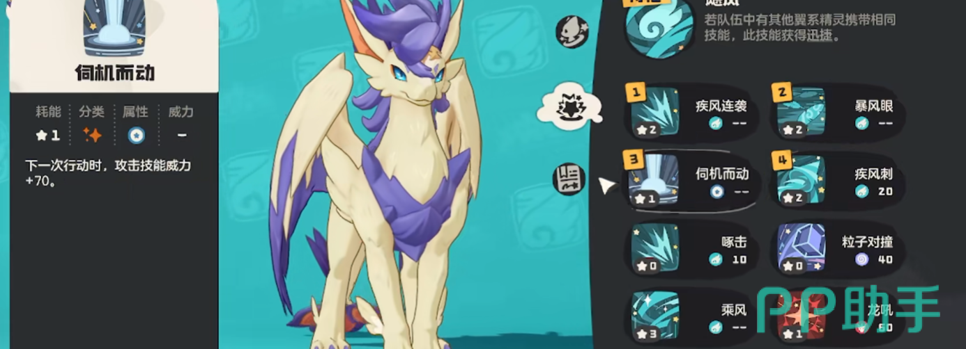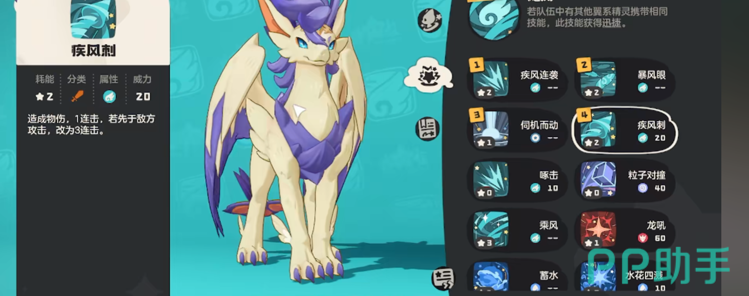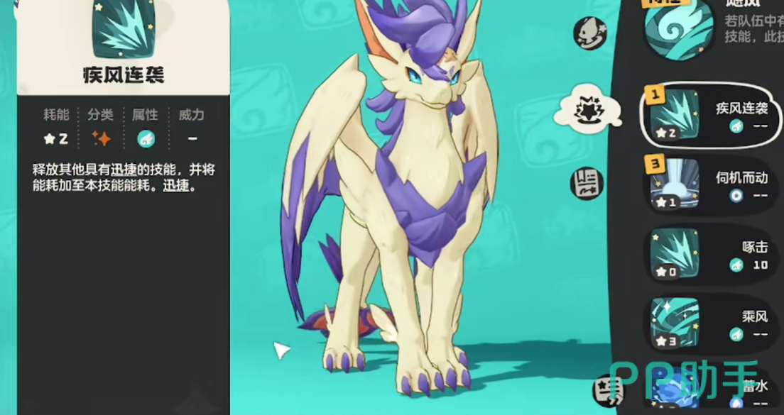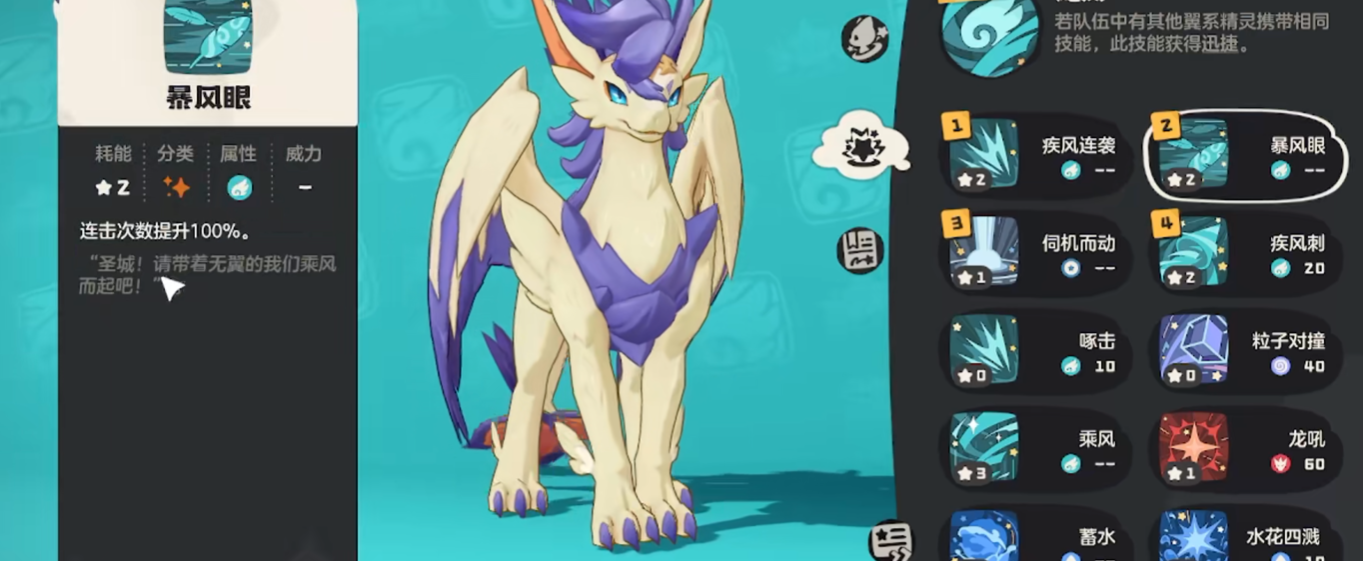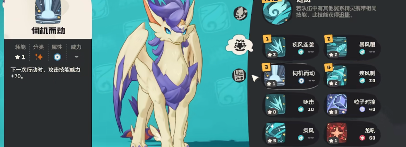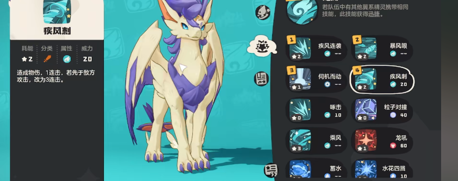 翼王的特性是在同样有翼系的精灵,和翼王佩戴同样的技能,技能会附加迅捷的效果。根据这个特性,我们第1个技能选择疾风连袭,这个技能能够释放其他具有迅捷技能,进行双重增加能让整体的实力提升并且耗能为两颗星。是翼王打出关键伤害的必要技能,整体队伍中的精灵能力也会上升。