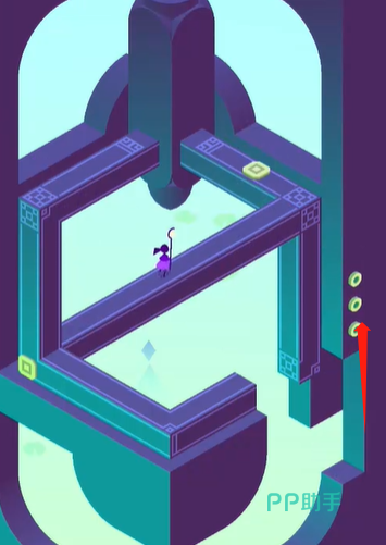 进入关卡后,首要任务是定位右侧垂直滑块。将其向上拖动至合适高度,使主角恰好停驻于平台边缘的支撑点——该位置是后续所有机关响应的前提。若角色落点偏差,将导致旋转后路径断开。完成定位后,立即操作中央旋转机关,使其转动至指定角度,随后下拉对应控件,引导角色平稳移向左侧区域。此步成败关键在于旋转角度的精确性,误差超过15度即可能造成路径错位。