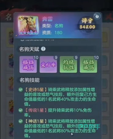 无限之境全面开放坐骑系统,支持自由装配。其中,“彩色奔雷”适配性尤为突出:基础属性成长曲线优异,具备格挡减伤与治疗强化双重被动;随星级提升,技能效果持续进化——初始仅可为残血单位恢复生命,升至高星后可同时治疗两名队友,并额外提升全队伤害率。这一机制使其从单一坐骑升级为功能性辅助单元,使“无限之境”远不止于挑战副本,实为策略推演的核心训练场。
