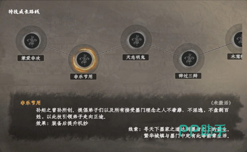 成功解锁后,玩家将获得五个专属能力:兼爱非攻,可在使用轻功时减少20%的消耗;非乐节用,解锁多种高级机关图纸权限;天志明鬼,大幅提升角色闪避能力;辞过三辩,允许每隔一段时间发动一次爆发性跳跃;以及木鸢机石,在制作机关装置时有30%的概率不消耗精力。