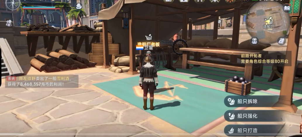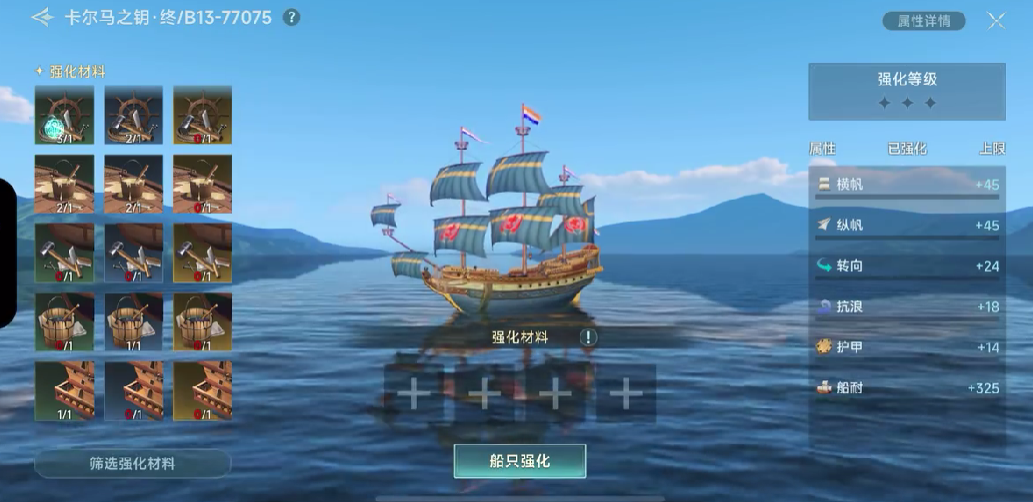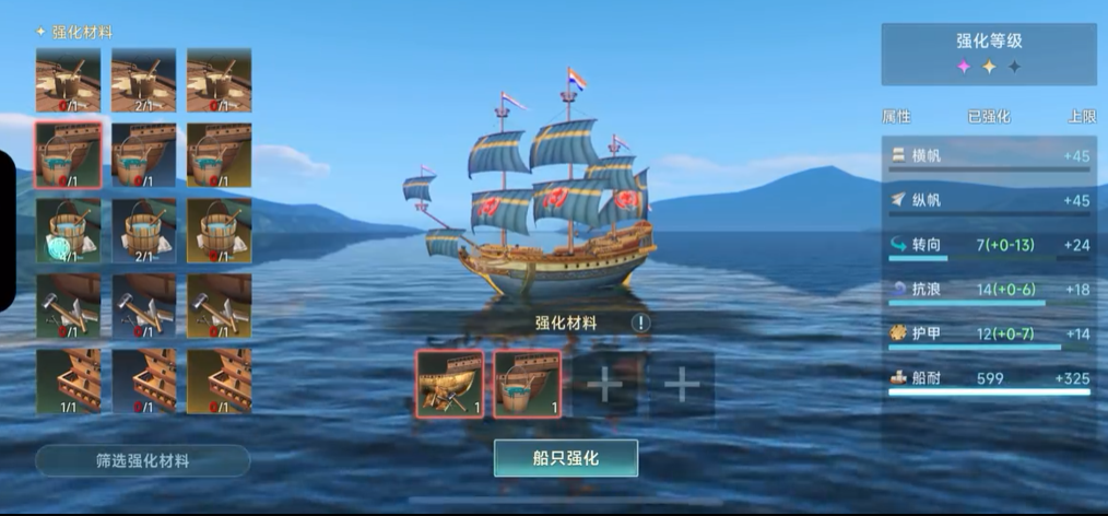 在了解了强化的优先级以后,我们在强化战船时,需要找到船老板,点击对话就会出现一个选项,里面有个强化选项,点进去,选择好想要强化的战船,就进入到强化界面了,在强化界面中,我们就可以按照护甲、船耐、转向、抗浪这个顺序来逐一进行强化。