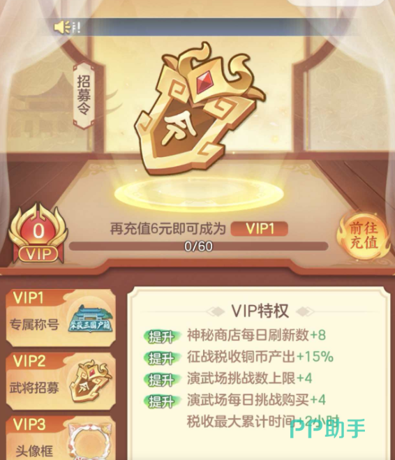 为强化新手过渡体验,游戏同步开放“新手成长礼遇”与“招募令VIP系统”。前者面向注册即送多档登陆礼包,涵盖铜币、体力、强化石等开荒刚需资源;后者则以6元充值为起点,激活VIP身份后可享专属称号、每日额外招募次数、经验产出加成及铜币收益提升等多项长期增益,形成可持续的成长优势。
