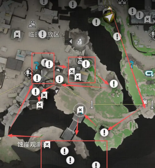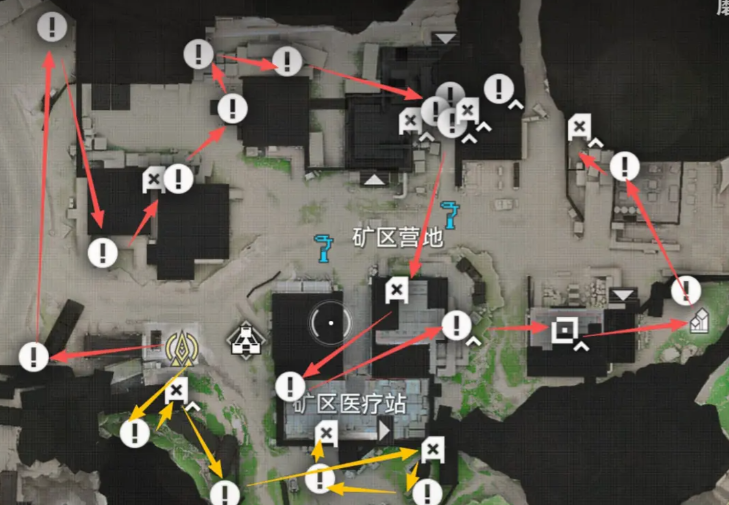 深入矿区内部后,资源密度显著提升。第二层高台区域可见醚质12;第三层屋顶瞭望台配置醚质11,建议在攀爬楼梯过程中主动观察顶部边缘与悬空平台,此类位置常设隐藏资源。营地外围的矿脉通路是另一重点区域,醚质9与醚质14均位于此带,推荐从集装箱滑索后方入口切入,路径连贯且标识清晰。