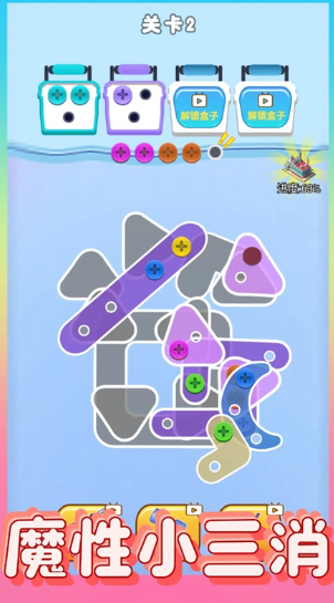 屏幕上出现的各种颜色以及各种造型的螺丝,玩家都需要将他们进行三个或者是三个以上的滑动连接才可以消除,经典的三消玩法之上又加入了新的元素,在整个闯关的过程既烧脑又非常解压。随着关卡任务的挑战难度提升时,玩家也可以使用里面的一些道具,它会帮助我们闯关更加顺利。