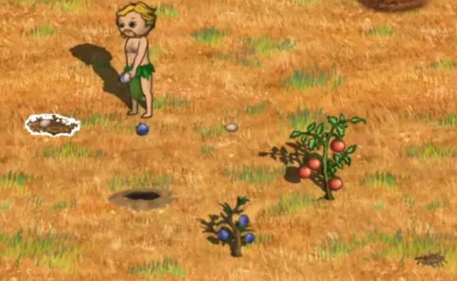 注意观察角色左上角的饥饿值状态,一旦归零,生命值将开始下降,直至死亡并触发重生机制,以新身份重新加入部落。初始可采集的食物包括鸟巢中的食物、托马果树果实及奶葡灌木产物。每个村民的饱食上限为100点,食用果实或鸟蛋可提升此上限。