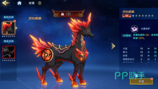 烈焰麒麟为金色品质坐骑,属于初始可直接激活的基础型伙伴。无需前置条件,角色创建完成即可使用。其初始属性涵盖智力、力量、体质三项基础维度,同步提升魔法攻击力与物理攻击力,实现三维双攻均衡强化。当升至一阶时,自动解锁被动技能“元素加护”,额外提供30%骑乘移动速度加成,显著优化地图跑动效率与副本间转场节奏,是前期战力过渡的关键支撑。