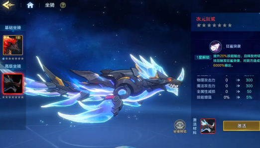次元狂鲨则为红色品质高级坐骑,定位为后期主力输出型伙伴。当前版本中暂未开放直接获取入口,需通过“圆满游”玩法获得。根据已披露的技能描述,该坐骑以强化双攻输出为核心设计逻辑,基础词条包含物理攻击力、魔法攻击力及百分比技能增强。满级状态下,两项攻击力均可突破300点阈值,技能增强效果稳定维持在5%,专精于纯输出向战力构建,契合高强度PVE与PVP场景需求。