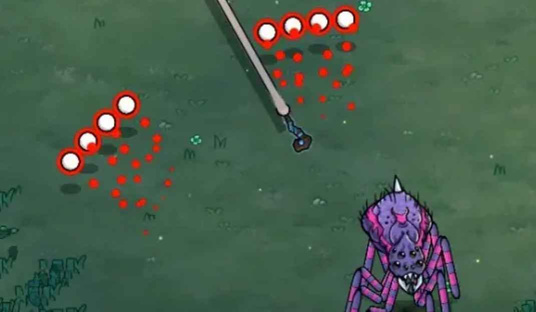 【五连聚散弹幕】:巨蛛先向前方发射五枚独立弹丸,短暂悬停后迅速横向展开为一条水平线并加速外推。此技能覆盖宽度大但起手明显,弹丸初始间距较宽。理想应对方式是在其抬臂蓄力瞬间向垂直方向(即朝向或背向巨蛛)快速移动一段距离,避开后续扩散路径的核心区域,而非沿弹道方向奔跑。