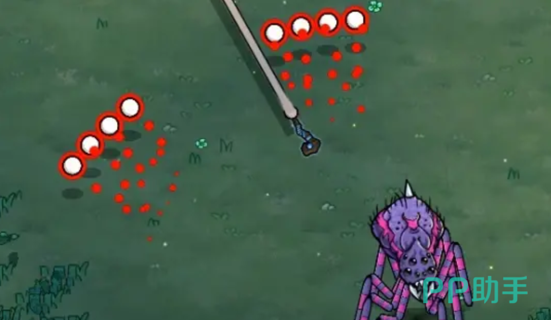 【八向扇形弹幕】:巨蛛抬起前肢,同步射出共八枚直线飞行弹丸,呈左右对称双排分布,每排四枚,中间预留明显安全通道。该技能释放前有约0.8秒抬手动作,弹速中等。推荐应对策略为横向小幅侧移,确保身体始终处于两排弹幕之间的空隙区域,无需大幅位移即可完全规避。